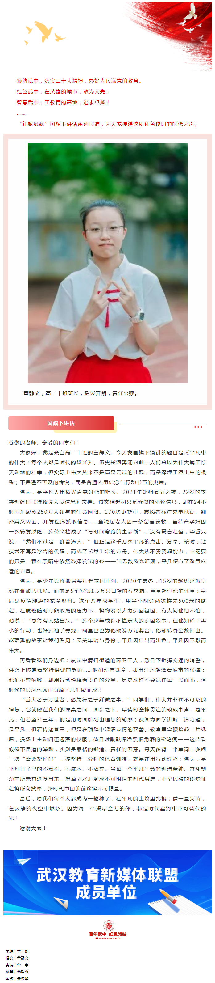 武汉中学是以武汉这所英雄的城市命名的学校,1920年由老一辈无产阶级革命家董必武等人创办,从这里走出了董必武、陈潭秋、李汉俊等三位党的“一大”代表。2020年正是武汉中学百年校庆之年,学校有着深厚的办学底蕴,自创办以来,一直秉承创办之初董老题写的“朴、诚、勇、毅”校训,着力培养中学生的健全人格,百年来为国家培育了大批建设者和接班人。