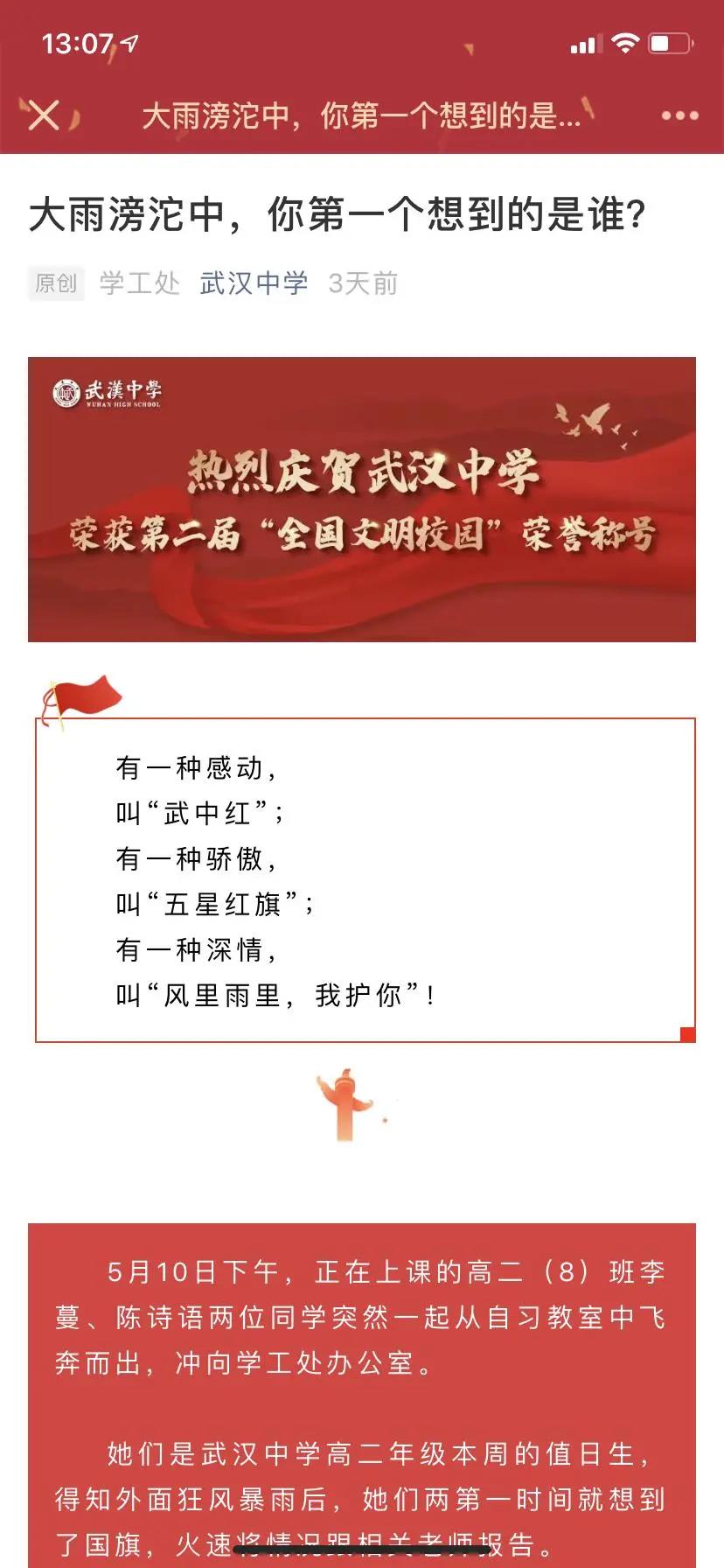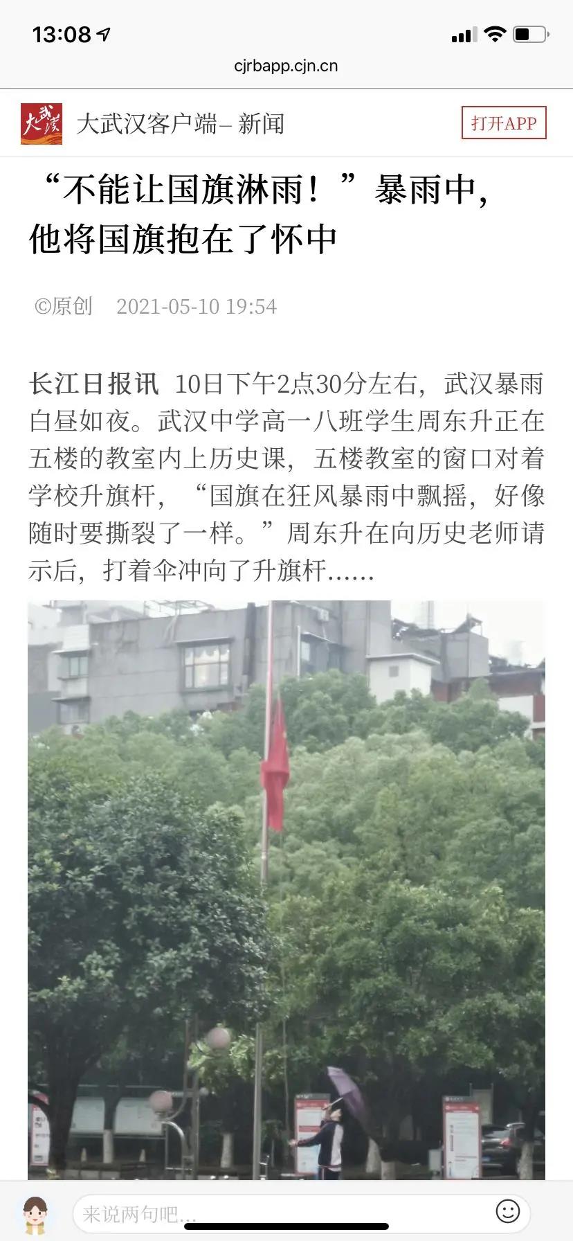 2021年5月10日,面对突如其来的狂风暴雨,武汉中学高一(8)班学生周东升冒着风雨将国旗降下;正在上课的高二(8)班李蔓、陈诗语两位同学,她们在风雨来临的第一时间就想到了国旗,并火速将情况跟老师报告。