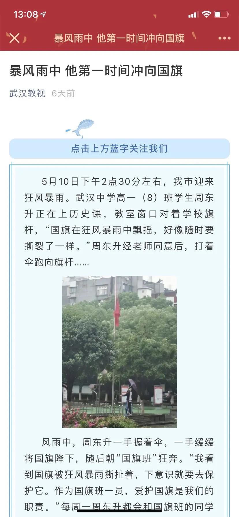 武汉中学高一(8)班学生周东升正在上历史课,他看着国旗在狂风暴雨中飘摇,好像随时要撕裂了一样。周东升经老师同意后,打着伞跑向旗杆……风雨中,周东升一手握着伞,一手缓缓将国旗降下。周东升同学说:“我看到国旗被狂风暴雨撕扯着,下意识就要去保护它。作为国旗班一员,爱护国旗是我们的职责。”学工处的刘主任特别强调“国旗班的成员就是国旗卫士,为国升旗,为旗护航是铁律。”